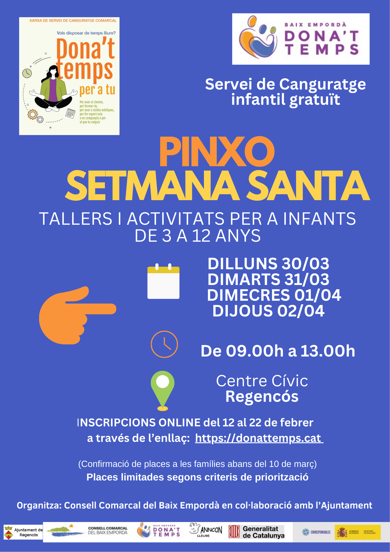 Tallers i activitats per a infants de 3 a 12 anys. Dies del 30 de març al 2 d’abril De 09.00 hores a 13.00 hores Centre Cívic de Regencós Les inscripcions es fan online del 12 al 22 de febrer a través de l’enllaç: https://donattemps.cat
