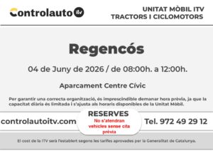 El dia 4 de juny de 2026 de 08:00 h a 12:00 h a l’aparcament del Centre Cívic de Regencós.